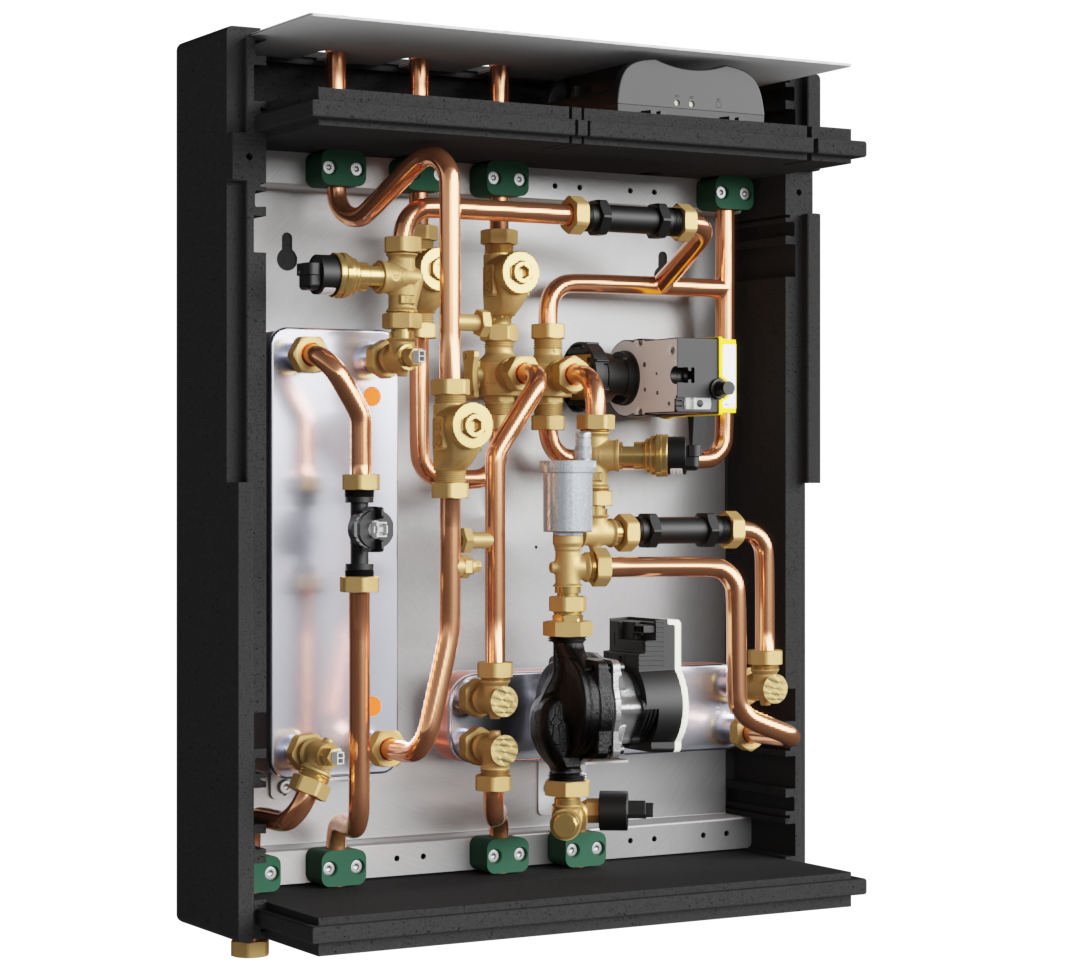 De afleverset is voorzien van een geïntegreerde mengregeling waardoor deze uitermate geschikt is voor lagetemperatuursystemen, zoals vloerverwarming en vloerkoeling. Door de geïntegreerde mengregeling en pomp in de afleverset kunt u besparen op de pomp, temperatuurregeling en maximale beveiliging op de vloerverwarmingsverdeler.